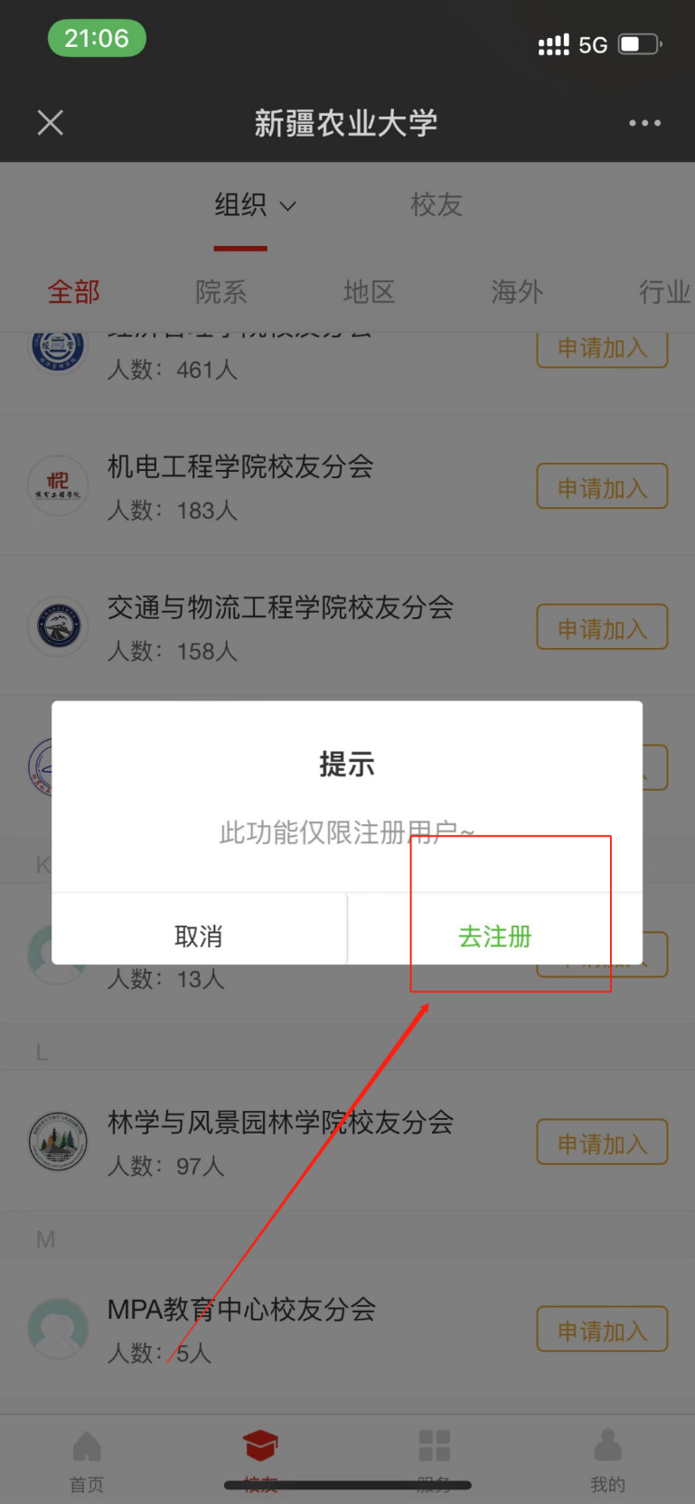 4.在点击“校友”一栏后,寻找学院点击“申请进入”