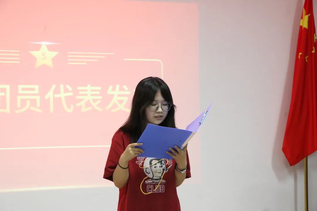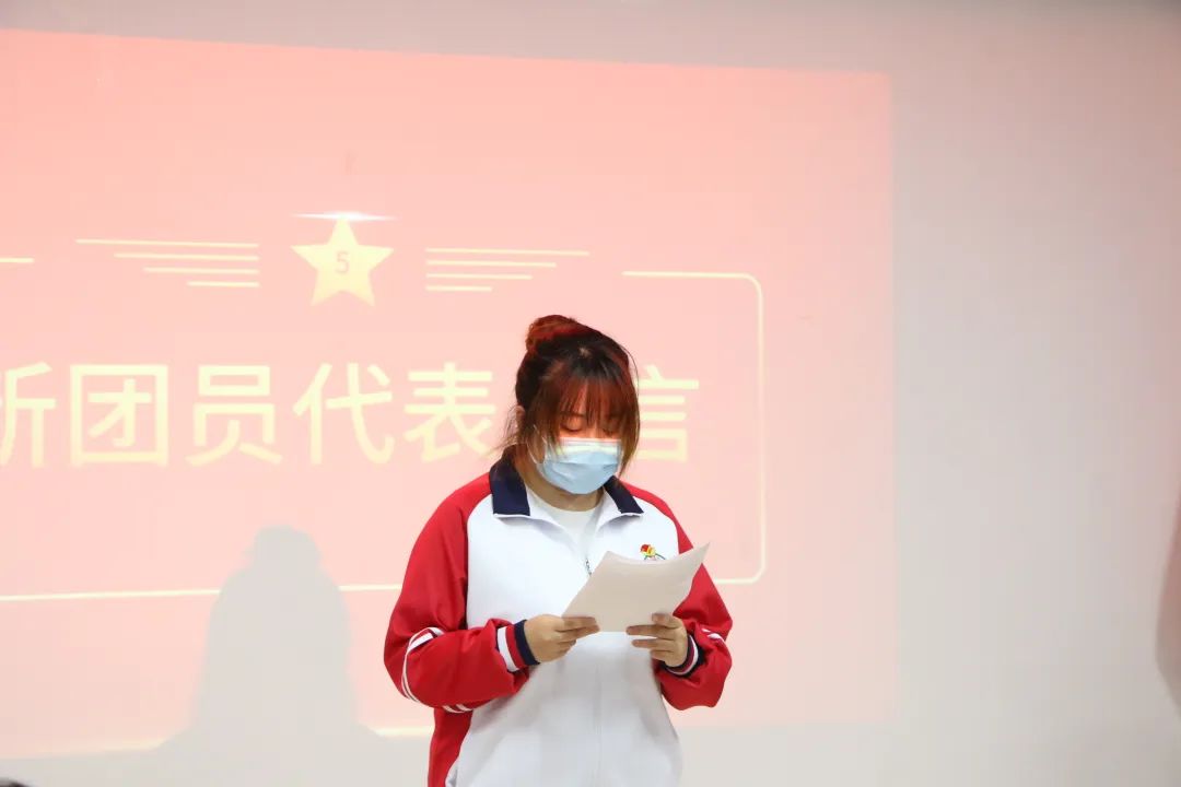 新团员代表汪汧雨郑重承诺:“我们一定会严于律己、以身作则,在同学中发挥表率作用,认真完成团组织布置的各项任务,团结同学,共同进步,持之以恒,做出成绩。”