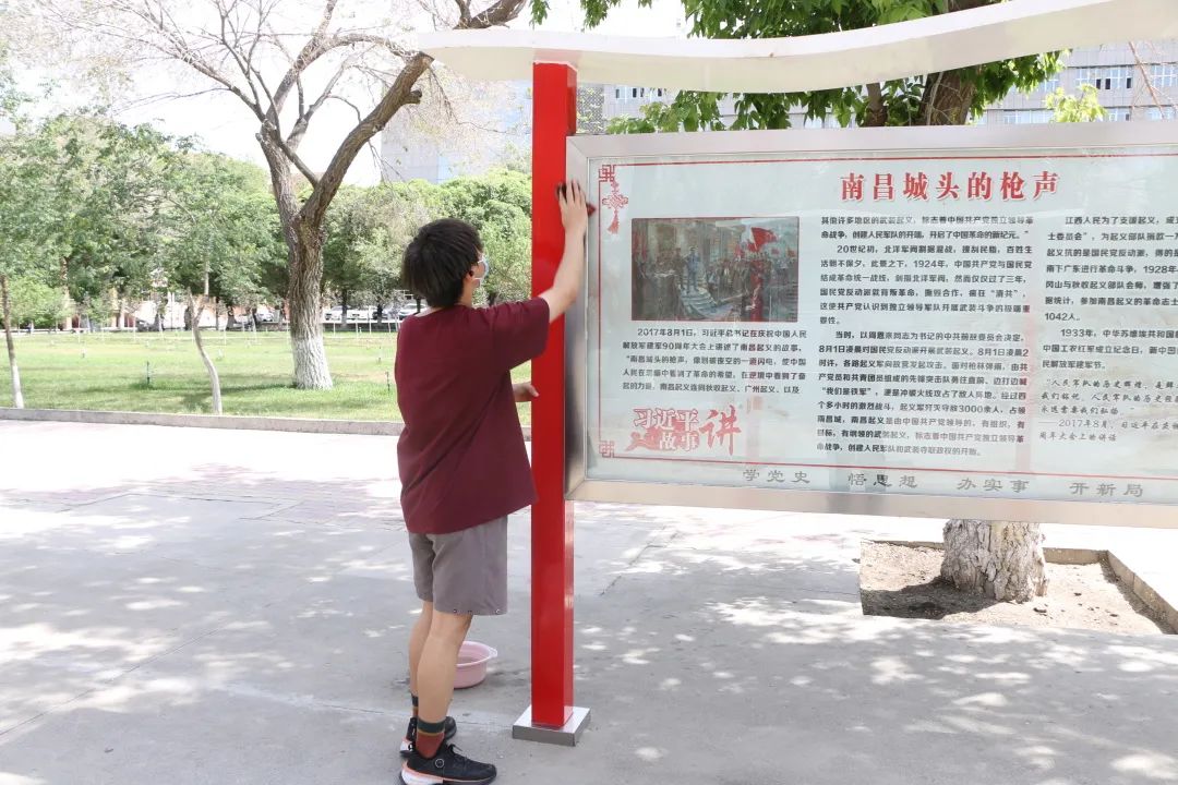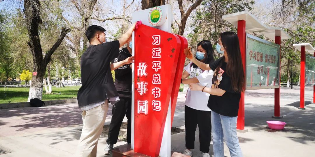 同学们拿着抹布、水盆、扫帚等劳动工具,认真地擦拭宣传栏,细致地清扫习近平总书记故事园,使这片红色文化教育圣地焕发出新的光彩。