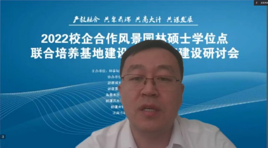 为深入学习贯彻党的二十大精神,积极推进我院专业学位研究生培养模式改革,进一步提高专业学位研究生培养质量,12月3日上午,林学与风景园林学院园林系组织召开“2022校企合作风景园林硕士学位点联合培养基地建设及案例库建设”研讨会。星空彩票体彩版研究生院副院长顾爱星、新疆风景园林学会理事长沈俊刚、林学与风景园林学院副院长王世伟、风景园林硕士学位点负责人朱军、新疆城乡规划设计研究院有限公司等7个研究生联合培养基地负责人和园林系全体教师出席了会议。会议由自治区风景园林学会副秘书长杨涛老师主持。