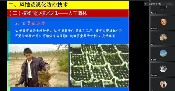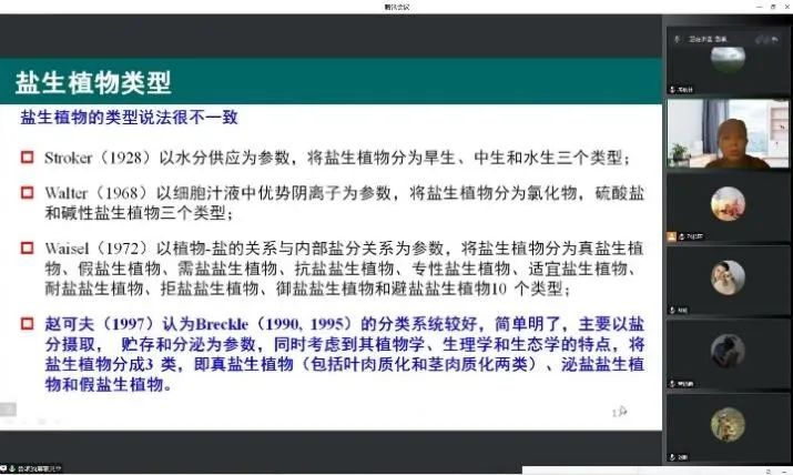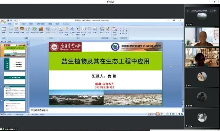 吉小敏研究员任新疆精河荒漠生态定位站站长,主要从事生态恢复和重建、生态监测和荒漠化防治等方面的科研和推广工作,此次报告的主题为荒漠化防治技术与模式的学术讲座。吉小敏研究员着重讲述植物固沙的原理及技术,分享了大量的荒漠化防治实践案例,结合目前的研究进展,引出对新疆荒漠化防治目前存在问题的思考。鲁艳副研究员主要从事干旱区恢复生态学方面研究,此次报告结合新疆第三次科学考察,讲解了荒漠盐生植物的种类、特点及其开发利用,并针对国内外大量研究案例,做了详细讲解。