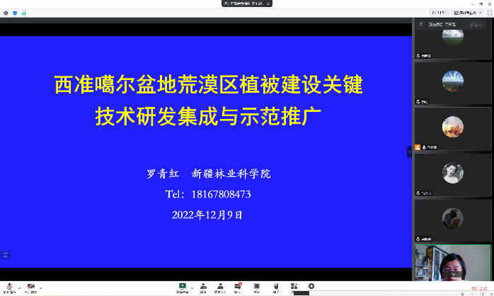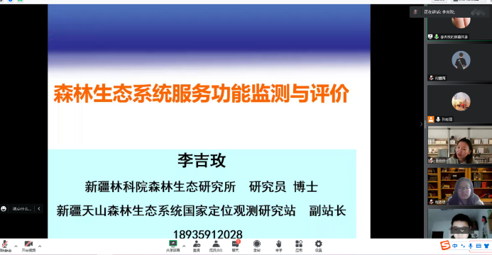 李吉玫研究员任新疆天山森林生态系统国家定位观测研究站副站长,长期从事山区森林生态监测与研究。此次报告结合新疆天山森林生态系统国家定位观测研究站的生态效益监测实践,对森林生态系统服务功能监测方法与评价指标进行深入浅出的讲解。罗青红副研究员长期从事林业生态科学研究、技术研发示范、成果转化推广工作,此次报告结合其研究团队近年来在林业生态工程建设方面做的大量实践工作,就西准噶尔盆地植被建设关键技术研发集成与示范推广做了全方位的阐述和讲解。