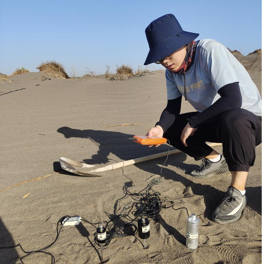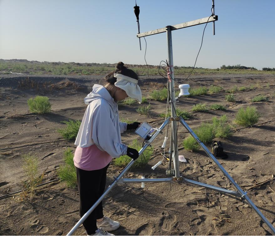 吐鲁番地区多大风天气,风速变化复杂多样。初期团队成员使用小型手持风速仪于标记样点处不同高度测定风速,长期的风速数据使用小型气象站布设在标记样点处,可以测定两个不同高程的风速风向变化,团队成员负责对气象站进行组装维护,按时将数据导出分析。