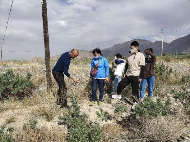 2022年4月初,实践团队以三区人才项目为依托,开展专业实践和社会实践。孙桂丽教授带领三名研究生,一名本科生,首先来到阿克苏的戈壁上考察野生沙棘及人工种植沙棘在荒漠化治理中的应用情况,经过实地考察,认识到沙棘的叶小,耐贫瘠、耐干旱,适应荒漠的自然环境,是优秀的抗旱植株,适合推广种植。