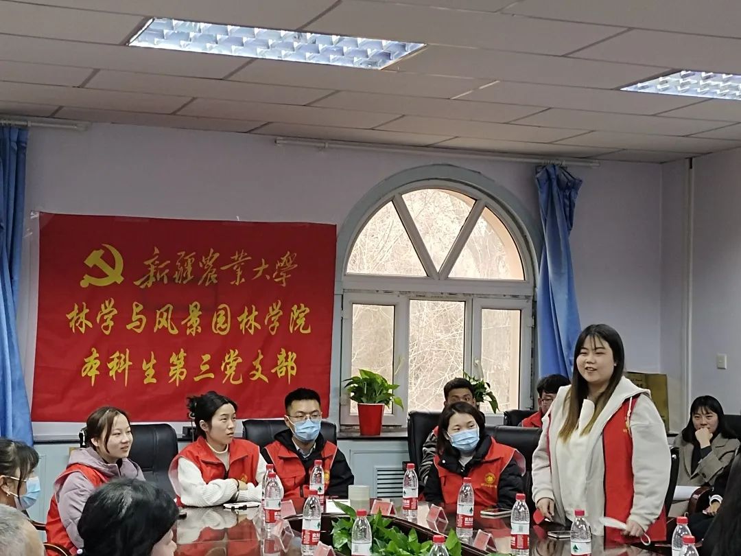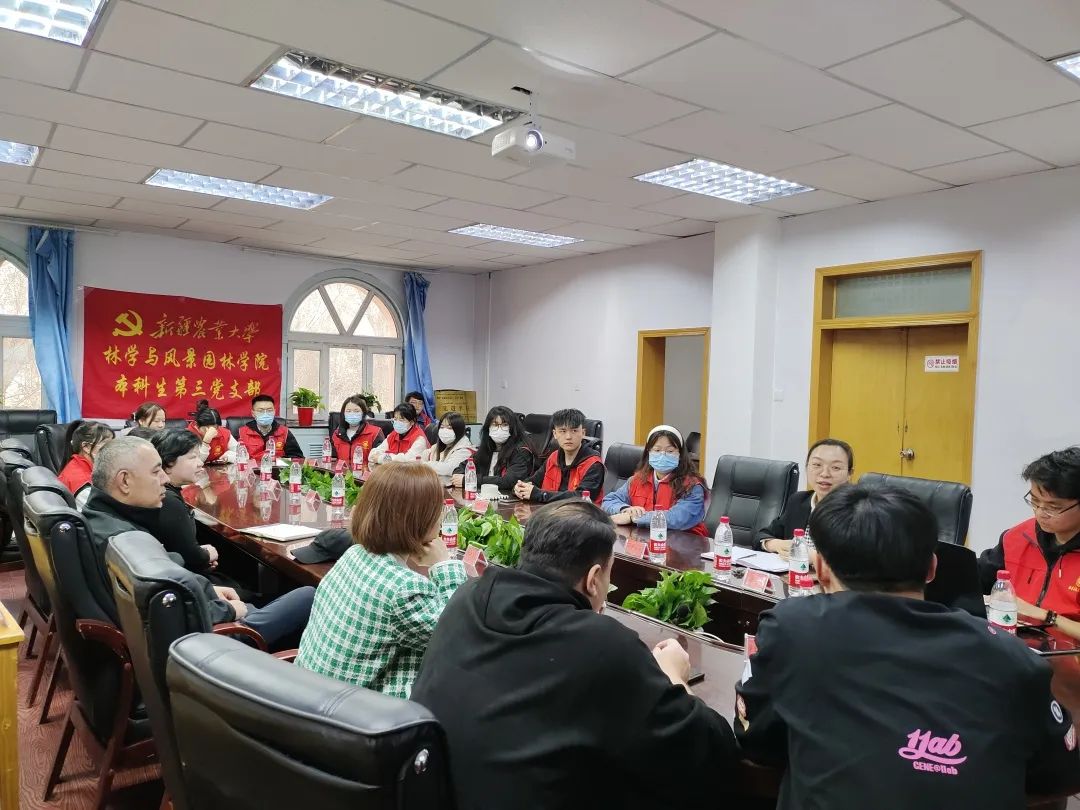 活动伊始,两个党支部的负责人分别介绍了各自支部的基本情况及特点。林园学院本科生三支部主要由林园学院园林专业的学生党员组成,学生处第三党支部主要由学生社区的党员老师组成,在本科生三支部书记秦雪老师的主持下,两个支部的党员共同学习了党的二十大精神、诵读了党章、重温了入党誓词、进行了座谈交流。为了使活动达到文明共建的效果,学生处三支部特别邀请了2号、10号和13号学生公寓的楼长与同学们就住宿中遇到的问题进行充分交流。