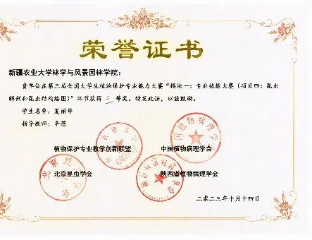 经过激烈角逐,我院参赛团队获得全国单项(昆虫解剖与结构绘画)三等奖(夏丽华),并同时荣获团体优秀奖和优秀组织奖各一项。本次大赛是我院首次参加植物保护专业能力大赛,在比赛中,参赛团队与来自其他高校的选手进行交流和互动,相互学习、探讨问题和分享经验。团队成员们还深入参与了展示的优秀项目,了解先进的植保科技发展和应用,同时也为研究生阶段的科研发展积累了宝贵的经验。