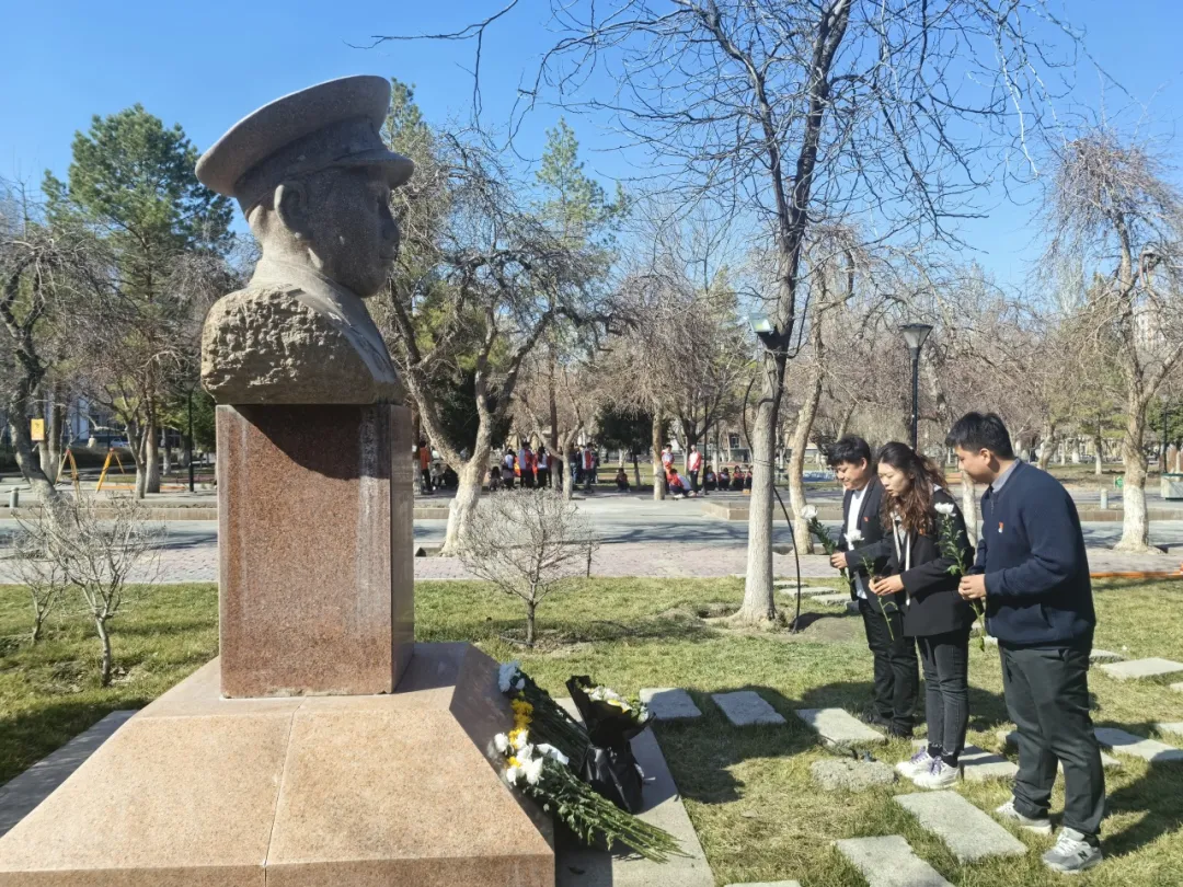 在学生党员董玲萍同志精彩的讲述中,我们深刻领悟到了王震将军的崇高品质和不朽功绩,感受到了他们顽强拼搏、不屈不挠的革命精神。随后,在《献花曲》的婉转乐章中,我们怀着崇敬之情,向王震将军雕像献上鲜花,行三鞠躬礼,向革命先烈表达我们永远铭记的誓言和敬意。