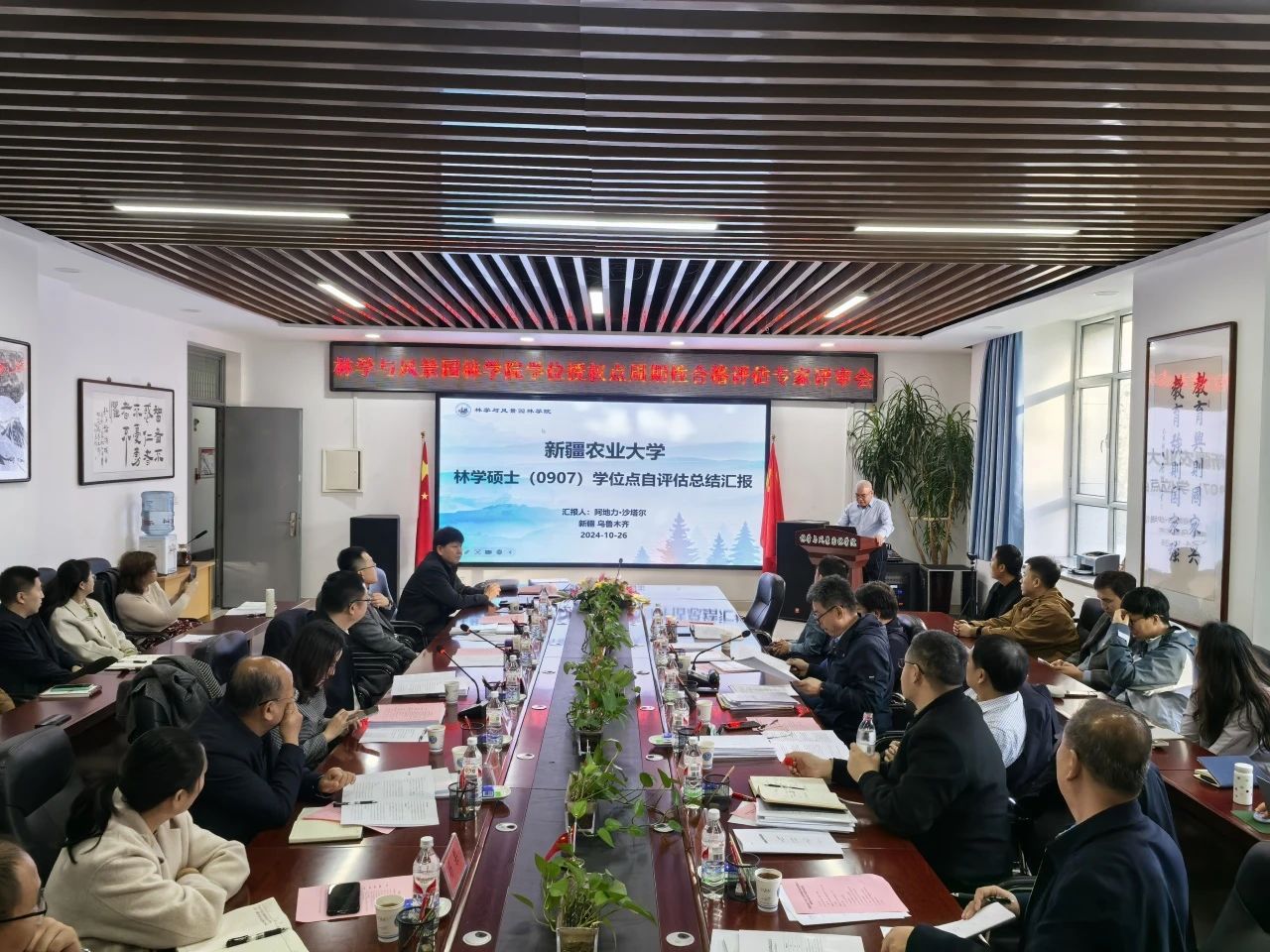 林学与风景园林学院院长阿地力·沙塔尔和林学系主任叶尔江·拜克吐尔汉,对林学一级学科硕士学位授权点和林业硕士专业学位授权点建设情况进行了汇报。与会专家认真听取了汇报,仔细查阅了自评报告及相关支撑材料,提出意见进行了交流。随后,专家们对林学与风景园林学院学位授权点进行集中评议,一致同意这两个学位点评审结果为合格。同时专家组围绕学位授权点对人才培养目标定位、聚焦国家战略需求凝练学科特色,加大高层次人才引育,加强研究生对外合作交流等方面提出了宝贵建议。
