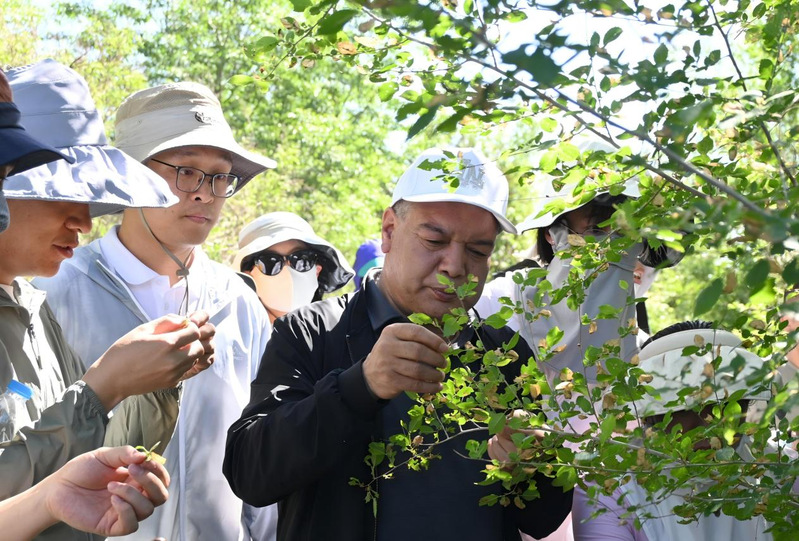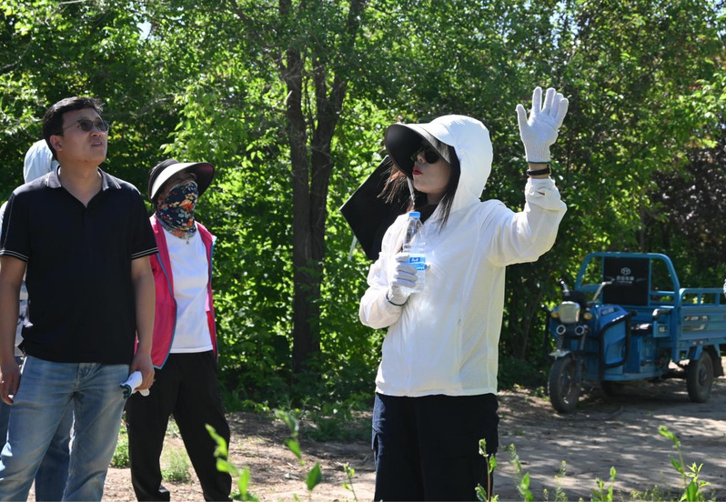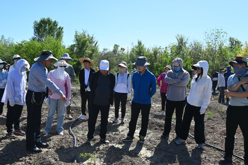 参观途中,阿地力·沙塔尔院长与老师们发现田间害虫,随组织专业教师开展现场研讨与教学,教师们结合实例进行害虫识别与防治知识讲解,将课堂搬到田间地头。这种互动式教学不仅展现了学院对实践教学的重视,更体现了教职工们“学以致用、知行合一”的专业精神。