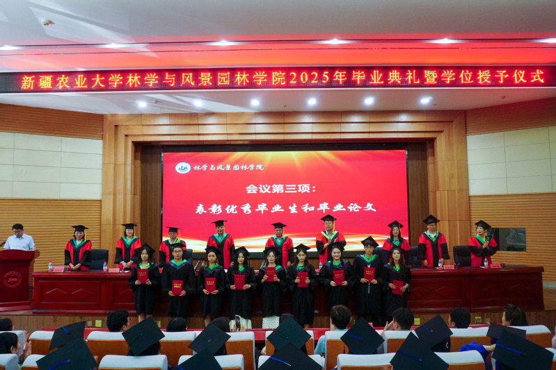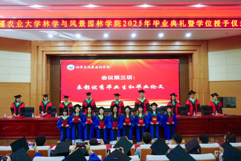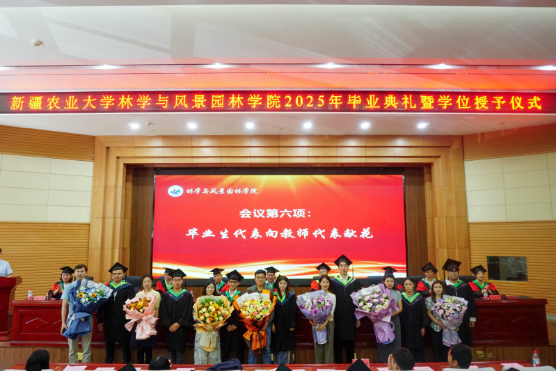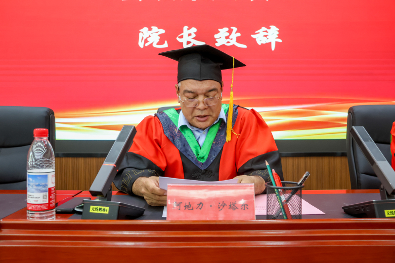 院长阿地力·沙塔尔的致辞,如温暖而有力的风帆。他向大家提出三点殷切期望:第一,希望你们做“绿水青山”的守护者;第二,希望你们做“勇攀高峰”的开拓者;第三,希望你们做“胡杨精神”的传承者。同时,他对毕业生们你们嘱托道:“愿你们成为‘种子’,把论文写在新疆大地,让绿色梦想在天山南北生根发芽;愿你们成为‘桥梁’,在人与自然、传统与现代、边疆与内地之间,搭建和谐共生的纽带;愿你们成为‘旗帜’,在强国建设、民族复兴的征程中,彰显新疆青年‘功成必定有我’的担当!”他希望大家以青春之我、奋斗之我,在建设美丽中国的伟大征程中,书写无愧于时代、无愧于人民的精彩篇章!