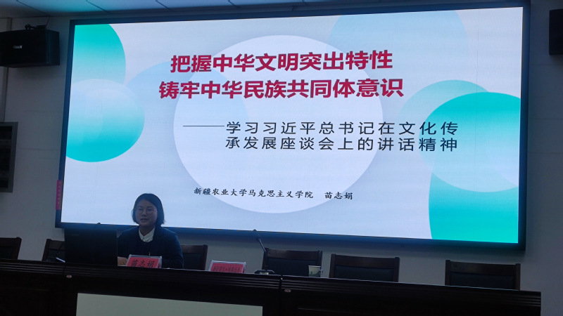 首先,加强理论学习、厚实理论功底。马克思主义学院教工第一党支部书记苗志娟为党员们讲授了题为“把握中华文明突出特性 铸牢中华民族共同体意识”的主题党课,从“习近平总书记在文化传承发展座谈会上的讲话要点、深刻把握中华民族的突出特性、在把握中华文明突出特性中铸牢中华民族共同体意识”三个方面进行讲述。苗志娟强调,以铸牢中华民族共同体意识为工作主线,决定了新时代党的民族工作的三重基本任务,其归结为一点,就是要站在文明自觉和坚持中华文化主体性的高度,推进中华民族交流交融,建设中华民族共同体,推动中华民族走向认同度更高、凝聚力更强的命运共同体。