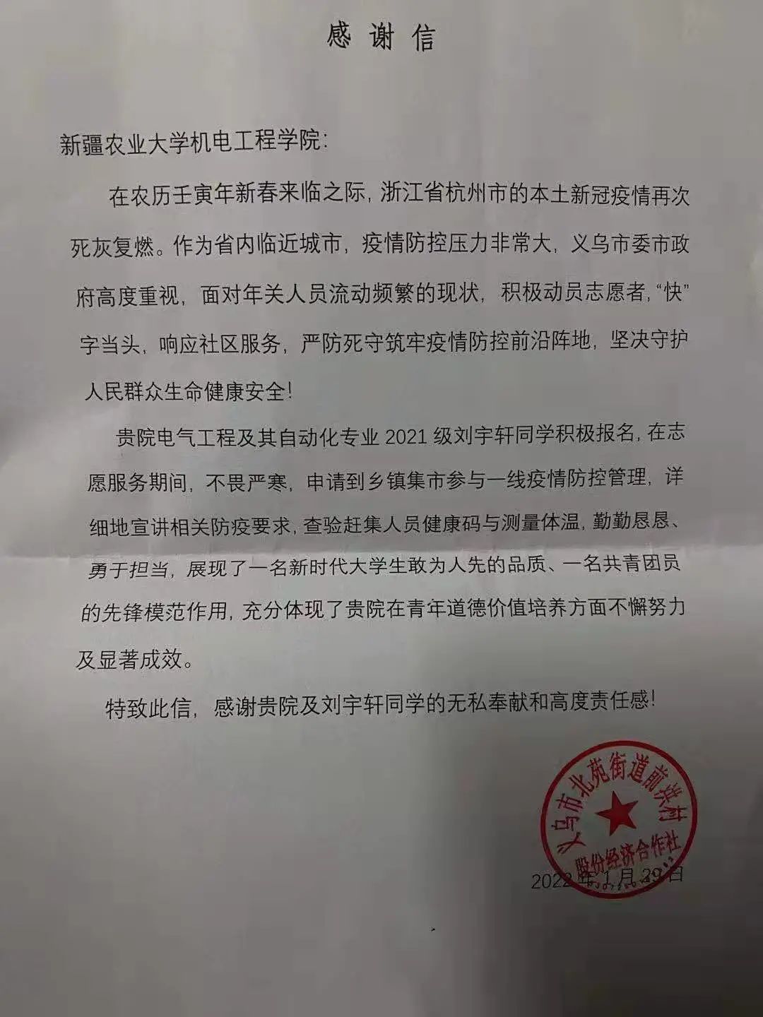 今天我们采访的主人公是电气2103班的刘宇轩同学。在寒假期间,浙江省义乌市疫情严重急缺防疫志愿者,这位面对陌生人会紧张的男孩毅然选择成为一名防疫志愿者。在志愿期间吃苦耐劳、认真负责,得到了义乌市北苑街道前洪村合作社的感谢。