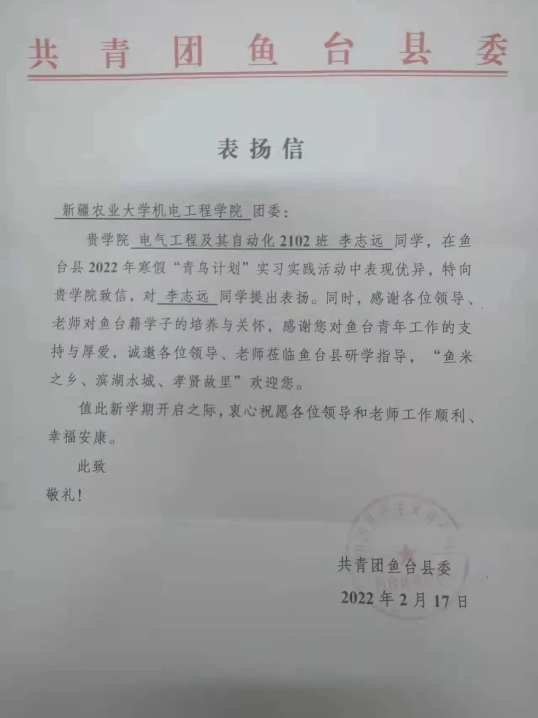 今天,我们采访的主人公是电气2102的李志远同学。寒假里,这个自称平凡的同学付出了勇敢和实践,积极参加了鱼台县2022年寒假“青鸟计划”实习实践活动,并在其中表现优异,得到了共青团鱼台县委的表扬。