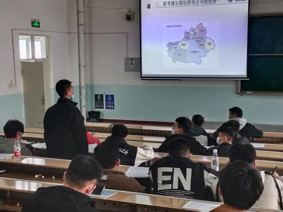国网博尔塔拉供电公司专场招聘会宣讲人员对公司概况进行介绍;有疑惑的同学对宣讲人员提出问题,并得到公司宣讲人员的一一解答。