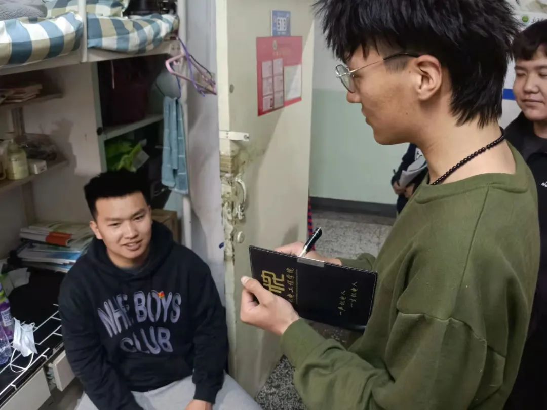 (志愿者在食堂调研)(3)权益进宿舍:宿舍是同学们学习和生活的重要场所,良好的生活后勤保障关系到每位同学的切身利益。为确保调研工作顺利开展,切实维护同学的宿舍权益。夏荷娜子在女生宿舍进行调研工作,郭世豪和张传琛在男生宿舍进行调研工作。