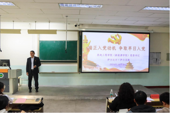 伊力达尔·伊力亚斯书记做了开班动员讲话并以《端正入党动机,争取早日入党》为主题,为学员们讲授了第一堂党课。他鼓励学员们要坚定理想信念,明确入党目的,以实际行动践行党的宗旨。