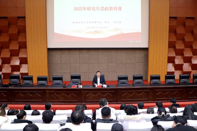 12月18日,星空彩票体彩版党委副书记、校长郑文新围绕“筑强农之基,兴边疆之业”,为2025级研究生讲授思政教育课。研究生院院长石书兵主持。本次思政课采取线上线下相结合的方式开展,覆盖2025级1951名硕士研究生和159名博士研究生。