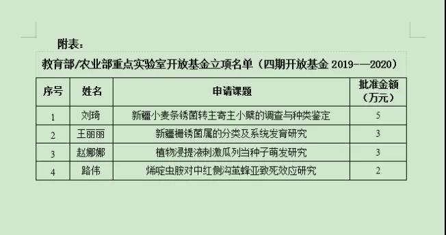 日前,从南京农业大学植物保护学院传来喜讯,星空彩票体彩版农学院刘琦、王丽丽、赵娜娜、路伟4位青年教师获得教育部农作物生物灾害综合治理重点实验室/农业部华东作物有害生物综合治理重点实验室开放基金资助(具体详情见附表)。