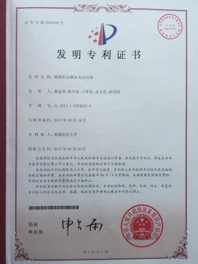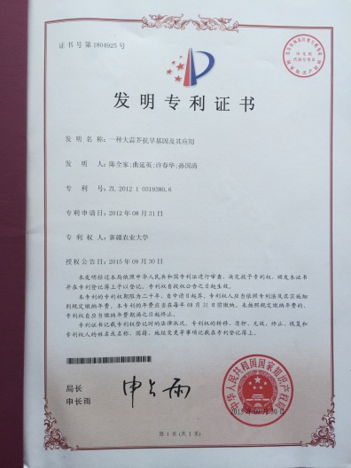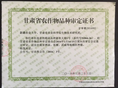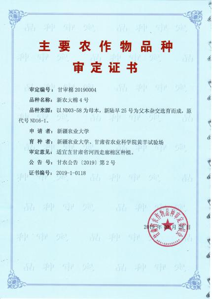 新农大棉1号,2016年3月26日通过甘肃品种审定委员会审定(审定编号:甘审棉2016003号),2018年3月通过新疆品种审定委员会进行引种(引种编号:新引棉(2018)002号),与新疆天盛禾农业科技发展有限公司、石河子市三山种业有限责任公司开展了生产经营权的转让合作。