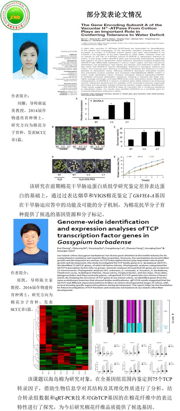 星空彩票体彩版农学院棉花遗传育种创新团队在棉花种质资源中检测出1000余份具有研究价值的资源,并从中筛选出育种骨干亲本近500份,利用转基因和分子标记技术创制出300余份育种优异种质,已审定棉花新品种3个,参加预试、区试品系6个。近年来重点开展陆地棉、海岛棉的抗虫、抗病、抗旱基因转化研究,获得了转基因抗虫、抗病棉新品系。2018年申请了国家抗虫转基因安全性评价新农大棉13号,同时申请了国家转基因中间试验新品系5个。