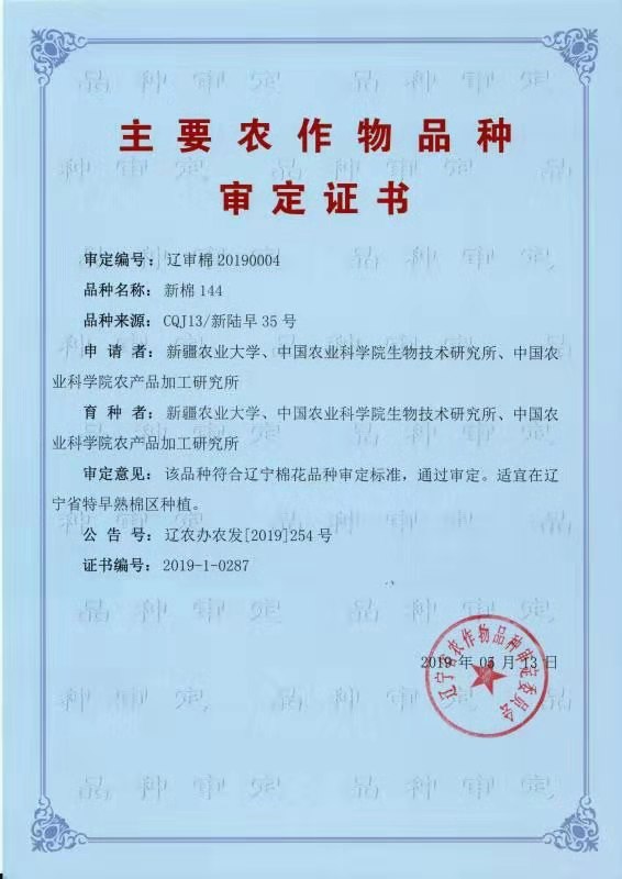 新棉144,2019年3月13日通过辽宁品种审定委员会审定(审定编号:辽审棉2019004)。该品种株型较紧凑,长势强,株高76.5 cm,结铃性强,单铃重5.5克,单株结铃8.8个;新棉144纤维品质较好,绒长34.1 mm,衣分42.2 %,整齐度指数86.0 %,断裂比强度36.2 cN/tex,马克隆值4.6,伸长率6.4%。综合指标达到Ⅱ型常规棉品种的标准。