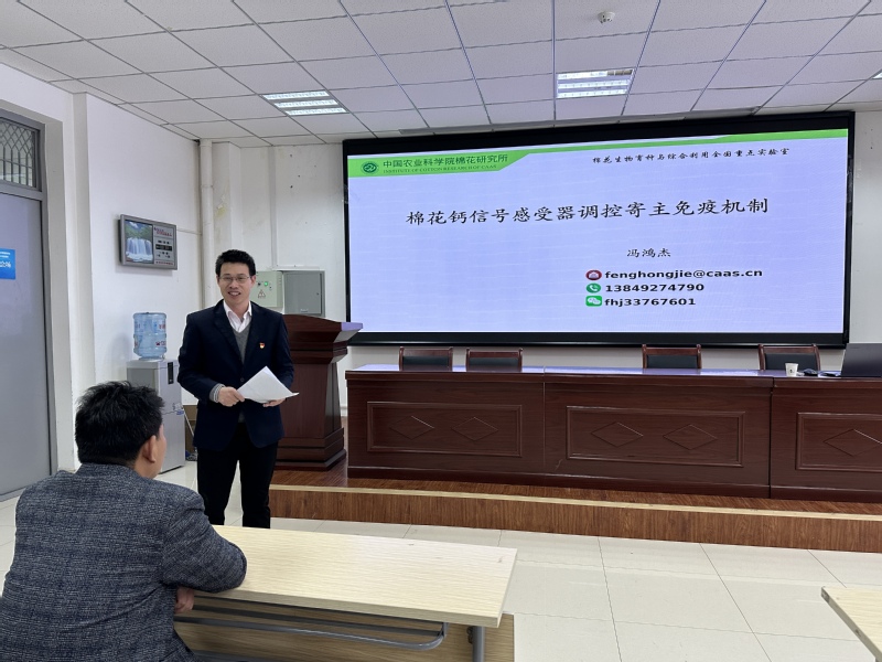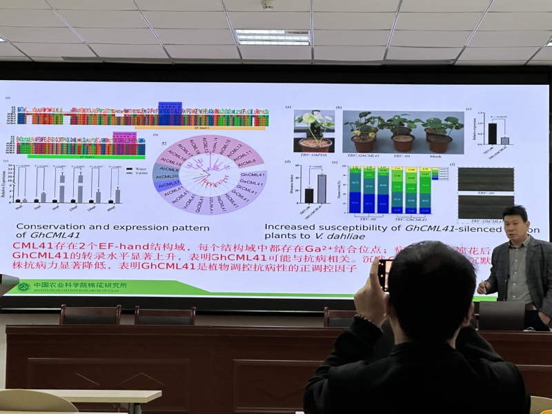 冯鸿杰研究员围绕《棉花钙信号感受器调控寄主棉花反应机制》深入讲解了棉花与病原菌互作过程中,钙离子信号通路在棉花抗病过程的作用机制,系统揭示棉花抗黄萎病的正向调节因子GhCaM7、GhCDPK28和GhCML41以及大丽轮枝菌效应子VdM35-1和VdASPF2的具体作用机制。