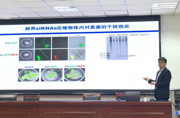 张涛研究员围绕《跨界RNAi在抗病-抗蚜中的有效应用及抗性棉花的种质创新》展开精彩报告,通过对比分析观察PDA培养基和感病棉花分离大丽轮枝菌的表型和转录水平上RNAi的差异,找到表达量高的跨界RNAi,对其在棉花中的功能及大丽轮枝菌中的干扰效应进行深入系统研究,进而创制出抗性较好的棉花种质资源;还基于跨界RNAi开展了抗蚜棉花种质创新工作。