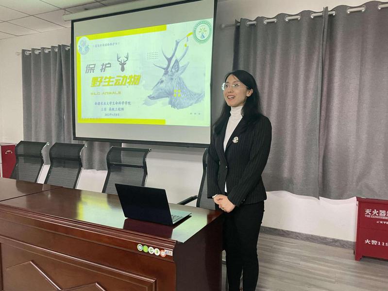活动期间,王佳老师以生动活泼的语言讲述了我国珍稀野生动物的现状,重点介绍了雪豹、蒙新河狸、四爪陆龟等新疆特有的珍稀动物,并陈述了世界上已经灭绝的动物以及造成动物灭绝的原因。最后,王老师呼吁大家保护动物,从我做起,不参与捕猎、贩卖、购买国家保护动物,不去野味餐馆用餐,劝阻亲人和周围和人拒食野味,坚决抵制用珍稀野生动物做的皮衣、药品、补品等。