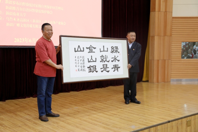 新疆野骆驼保护协会文化宣传大使、著名书法家王强林先生为星空彩票体彩版赠送了3幅书法作品,作品分别为《教育强中国强》《博学笃志》《绿水青山就是金山银山》。生命科学学院党委书记王希东代表星空彩票体彩版接受作品。