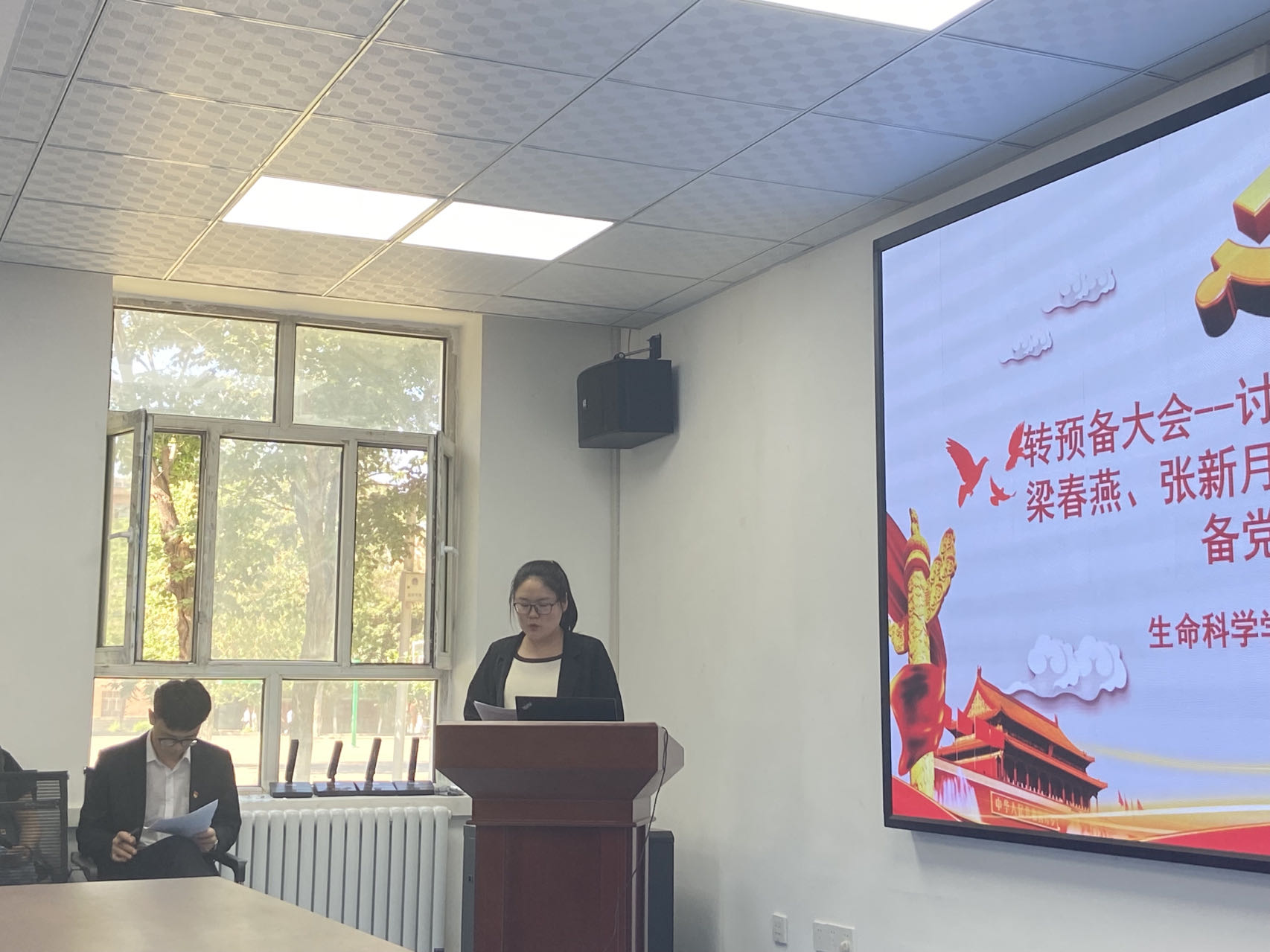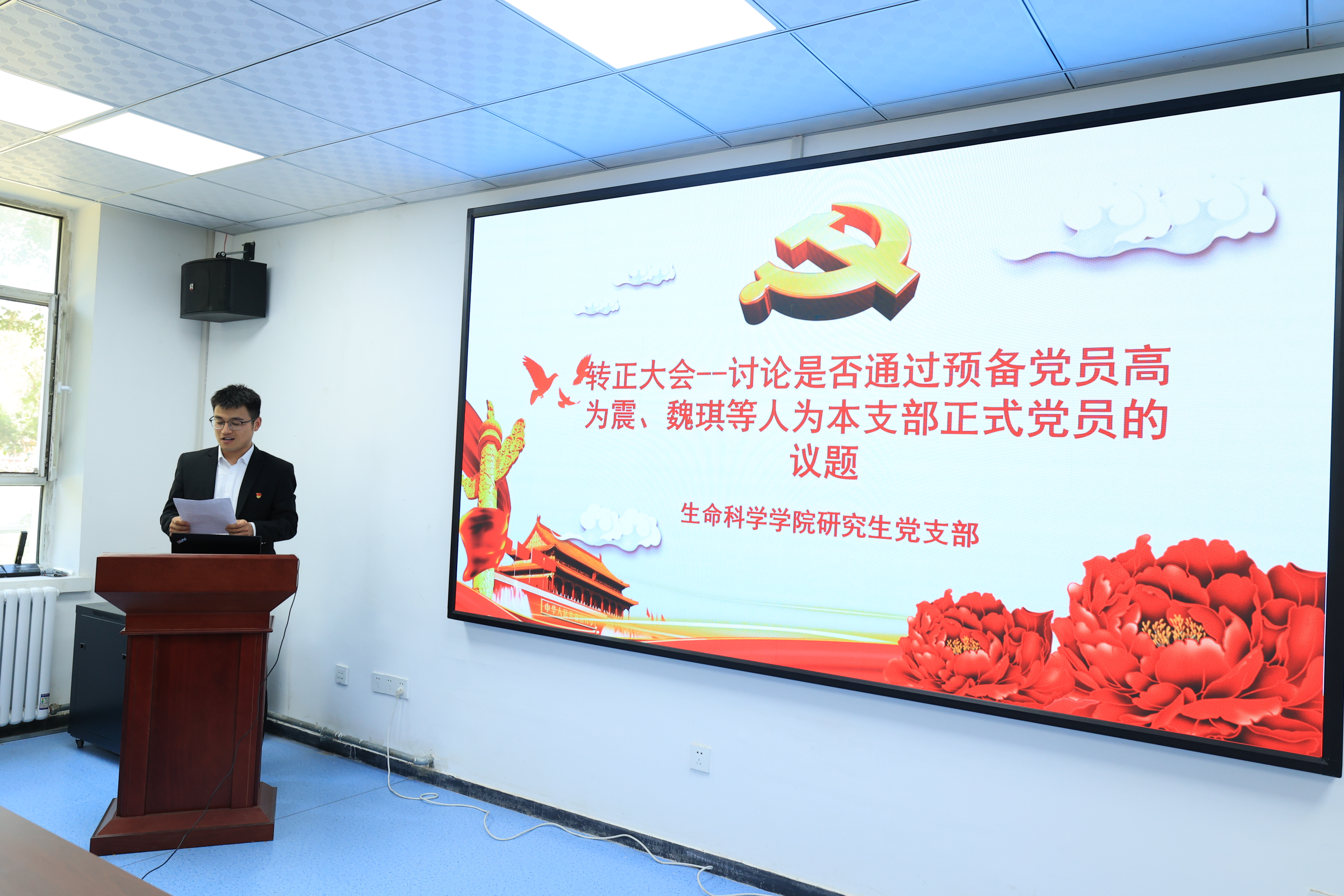 在预备党员转正会议阶段,先由转正对象高为震同志向大家宣读了转正申请书,从转正申请中我们了解到,在预备党员的一年里,高为震同志在政治思想、学习、生活和工作等各方面都取得了巨大的进步,认真学习,专心科研,积极参加各项活动;当然,其对于自身存在的一些不足之处,例如性格比较内向,不善于主动与同学交往、表达自己内心想法等也表明了想要改变的决心。随后4名预备党员依次提出转正申请,汇报培养考察期间在思想、学习、生活及工作上等相关情况。培养联系人和与会党员分别对预备党员在考察期内的表现向大会作了相关汇报,对其不足之处提出改进意见,并对其能否按期转正发表意见。