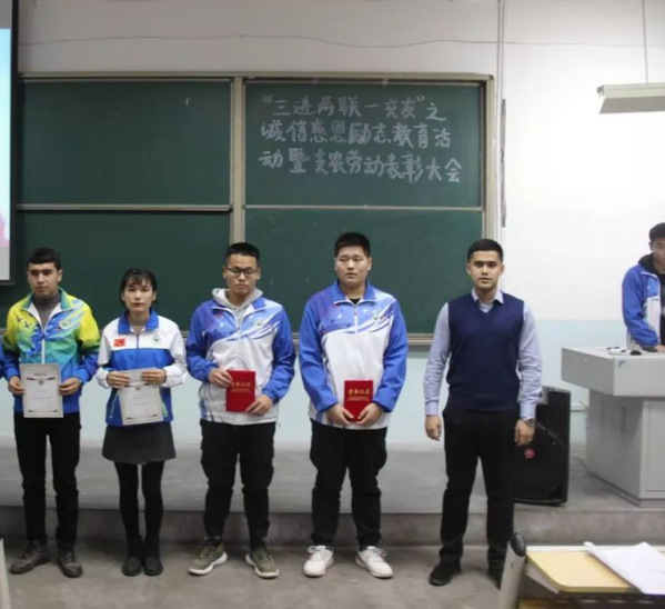 为深入贯彻习近平总书记系列重要讲话精神,培育和践行社会主义核心价值观,引导大学生树立诚信考试意识,遵守考纪考规。交通与物流工程学院于2019年12月11日在2416教室举办了“三进两联一交友”之诚信感恩励志教育活动暨支农劳动表彰大会。参加本次活动的有: 交通与物流工程学院团委书记艾尔夏提·吾买尔老师、交通与物流工程学院纪委委员、辅导员鲁德渊老师、交通与物流工程学院团委副书记苏比努尔·吾买尔同学、交通与物流工程学院学生会副主席迪力夏提·艾则孜同学,以及大一大二年级学生代表。