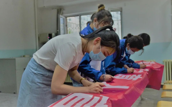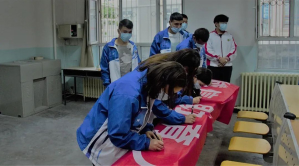 紧接着,在场学生依次有序地在诚信考试的横幅上进行签名。
