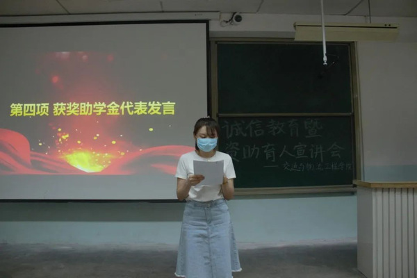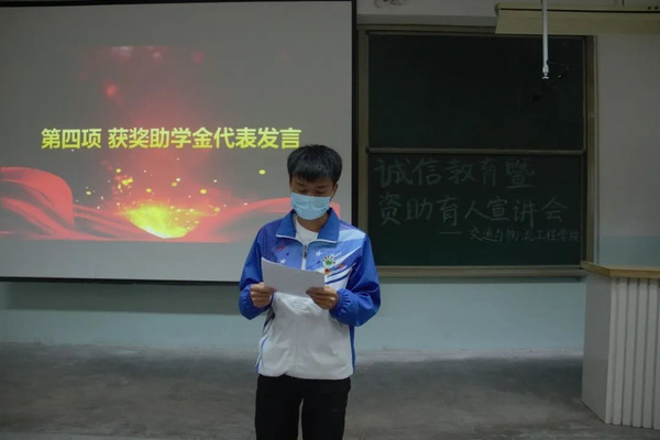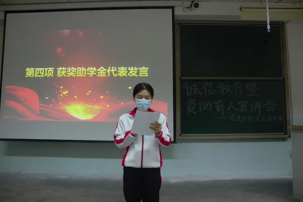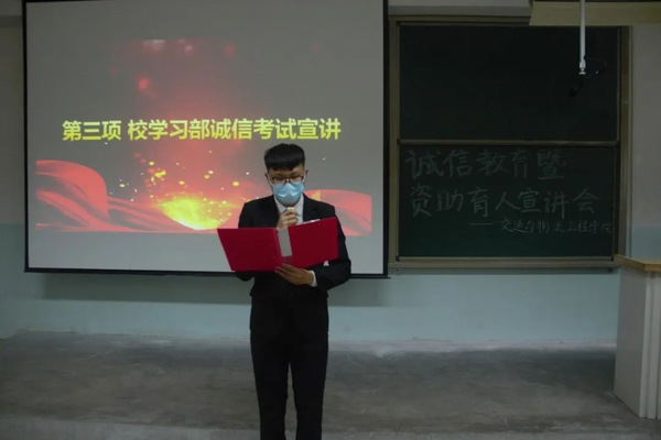 期末考试临近,为保此次考试更加公平公正,2020年6月13日20:30交通与物流工程学院通过开展“学以载道,诚信为本”教育暨资助育人宣讲会活动全面贯彻落实学校有关考试的要求,形成良好的诚信之风。参加本次活动的有星空彩票体彩版校学生会学习部副部长卢怀德,交通与物流工程学院学生会主席牛振祥,学生会志愿者协会会长张继涛以及各班级学生代表