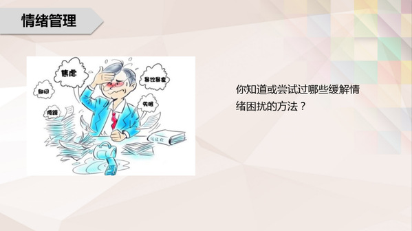老师告诉我们对待消极情绪还可以通过写日记的方式记录情绪从而找到对应的缓解方法。除此之外,适当放松心情需要通过呼吸,将注意力从外界抽离回来,使身心重建联系,觉察身体状态,专注当下。