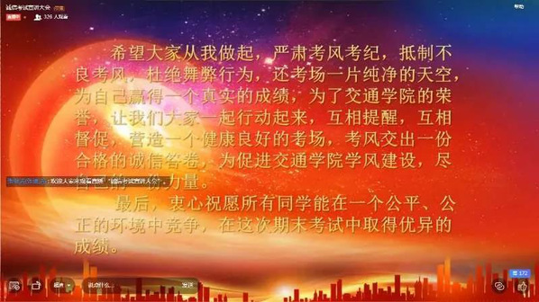 期末考试临近,同学们渐渐进入紧张的复习阶段。本学期受到疫情影响学习课程分为线上和线下相结合方式授课,由于有些同学不太适应这种新型的学习方式,不能很好的吸收所学内容,在即将进入考试复习阶段,强调抓紧复习的同时,更要进一步提升学生的诚信考试意识。