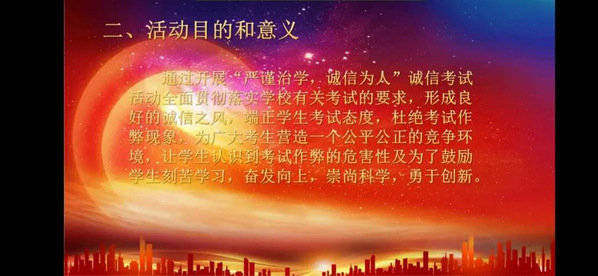 通过开展“以诚信为笔,用拼搏造砚,聚努力化墨,做自信答卷”诚信考试活动全面贯彻落实学校有关考试的要求,形成良好的诚信之风,端正学生考试态度,杜绝考试作弊现象,为广大考生营造一个公平公正的竞争环境。引导教育学生遵守考风考级,争做诚信考生。