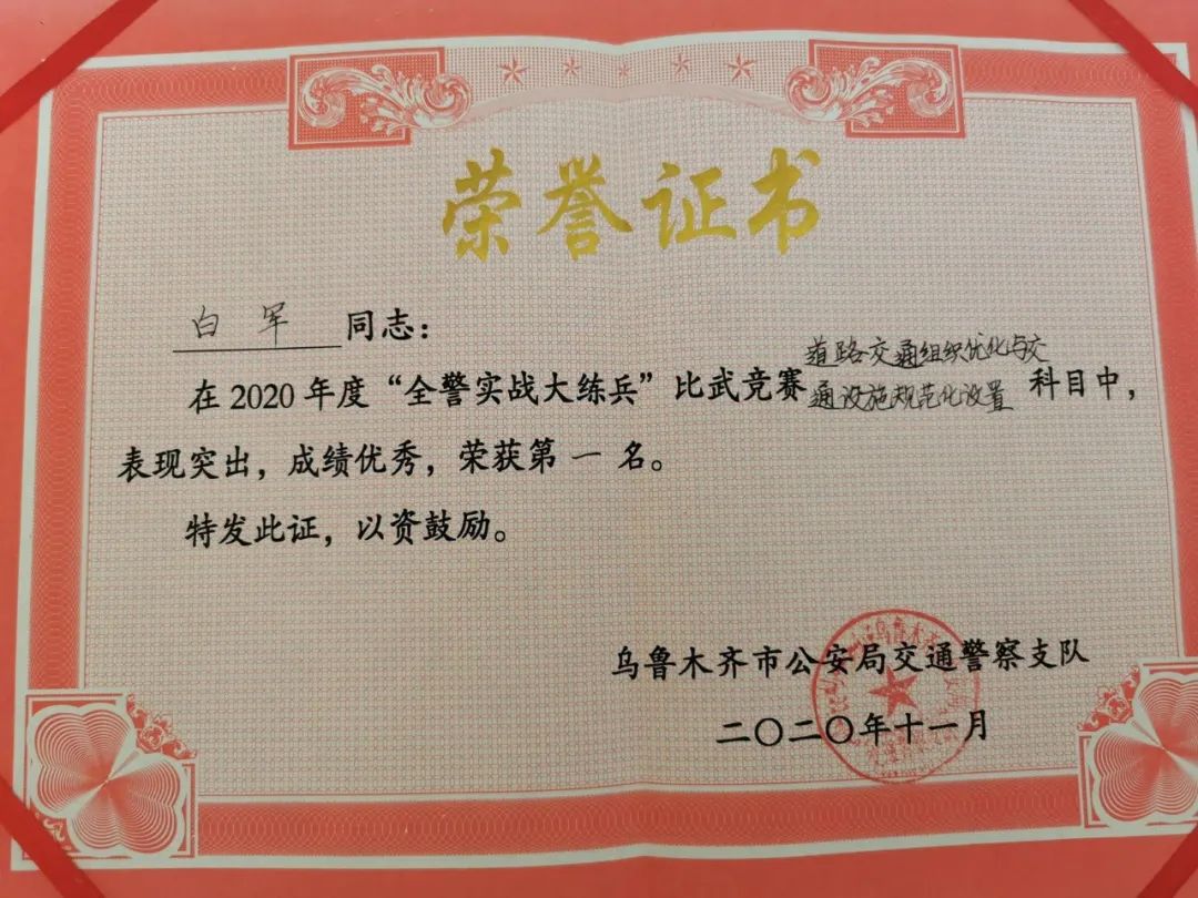 2009年开始完善乌鲁木齐道路基础设计,提升乌鲁木齐道路标线设施,在说到自己所负责的全乌鲁木齐的道路标线项目时,100多个日夜,平均每天300公里的行车路程、穿梭在20多个施工队中负责质量、监理等工作记录着为实现乌鲁木齐的道路畅通,标线的整洁、美观、大方所倾尽的努力与付出。2013年工作调整担任沙区交警大队西北路分队长时,白军全力保障16万人的出行安全与畅通。以高度的责任心和使命感诠释着“人民警察为人民”的初心与使命。吃苦耐劳、爱岗敬业、为民服务成为了白军工作上的信念与宗旨,在平凡的岗位上做着不平凡的工作,用一路坚持和敬业奉献守护着辖区人民的出行安全。
