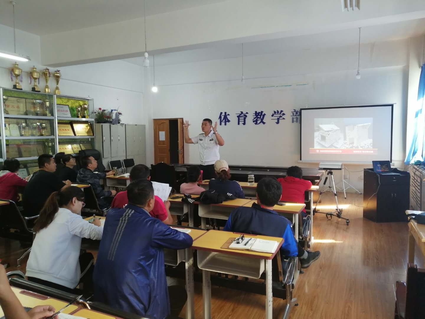 在培训课上,胡教官结合体育部建筑结构及所在地理位置的特点,采用PPT及现场模拟演练相结合的形式生动的讲解当火灾、地震发生时该如何自救及逃生,为教职工讲解了怎样预防火灾,怎样在地震、火灾时自救,如何在报火警时正确的叙述自己所在的位置等。培训内容涉及容易引发火灾的消防安全隐患、电器设施设备的正确使用方式、燃气及电器使用的火情紧急情况处置、鉴别灭火器是否有效和正确的使用方法、火灾应急疏散常识等。