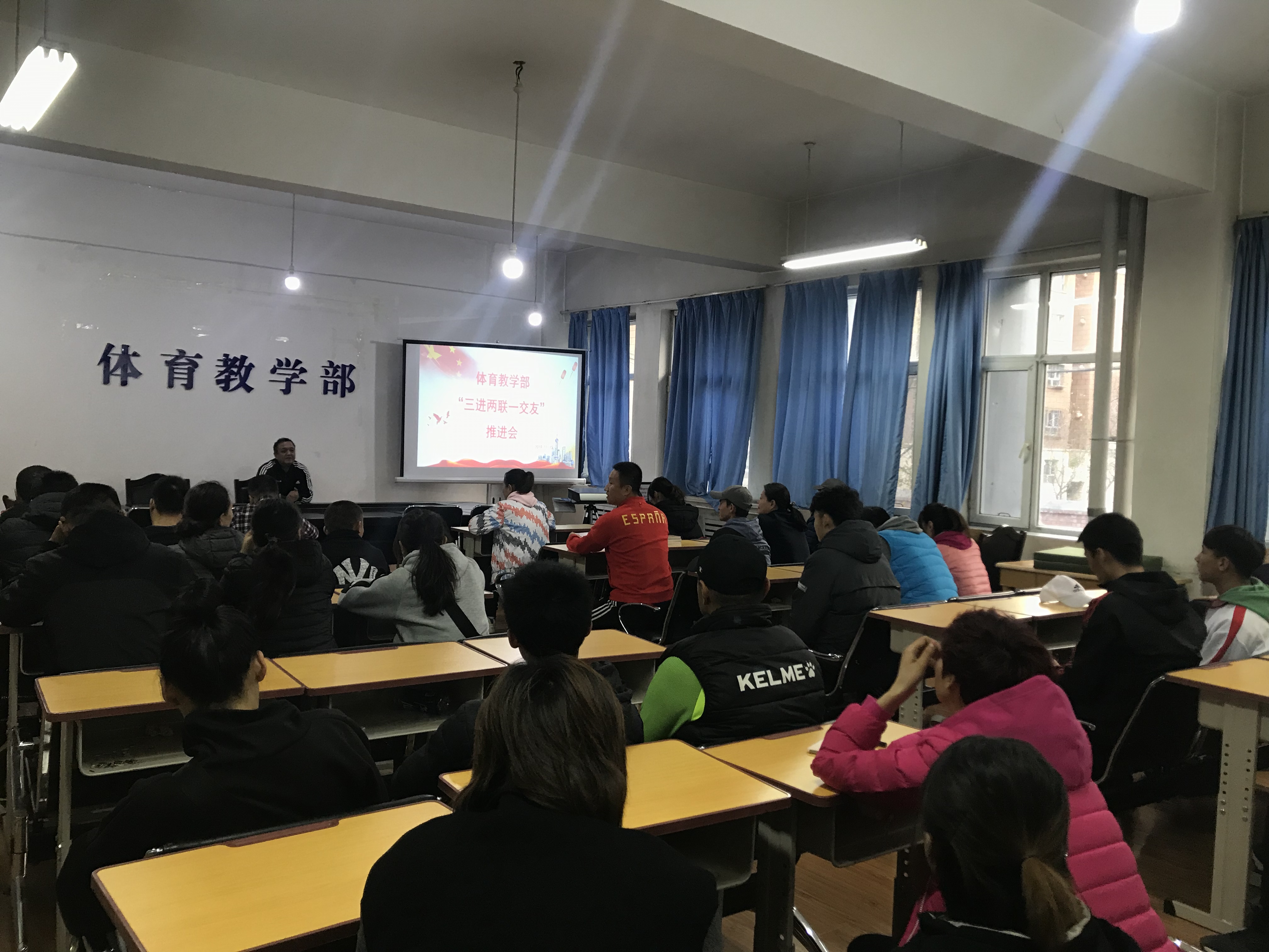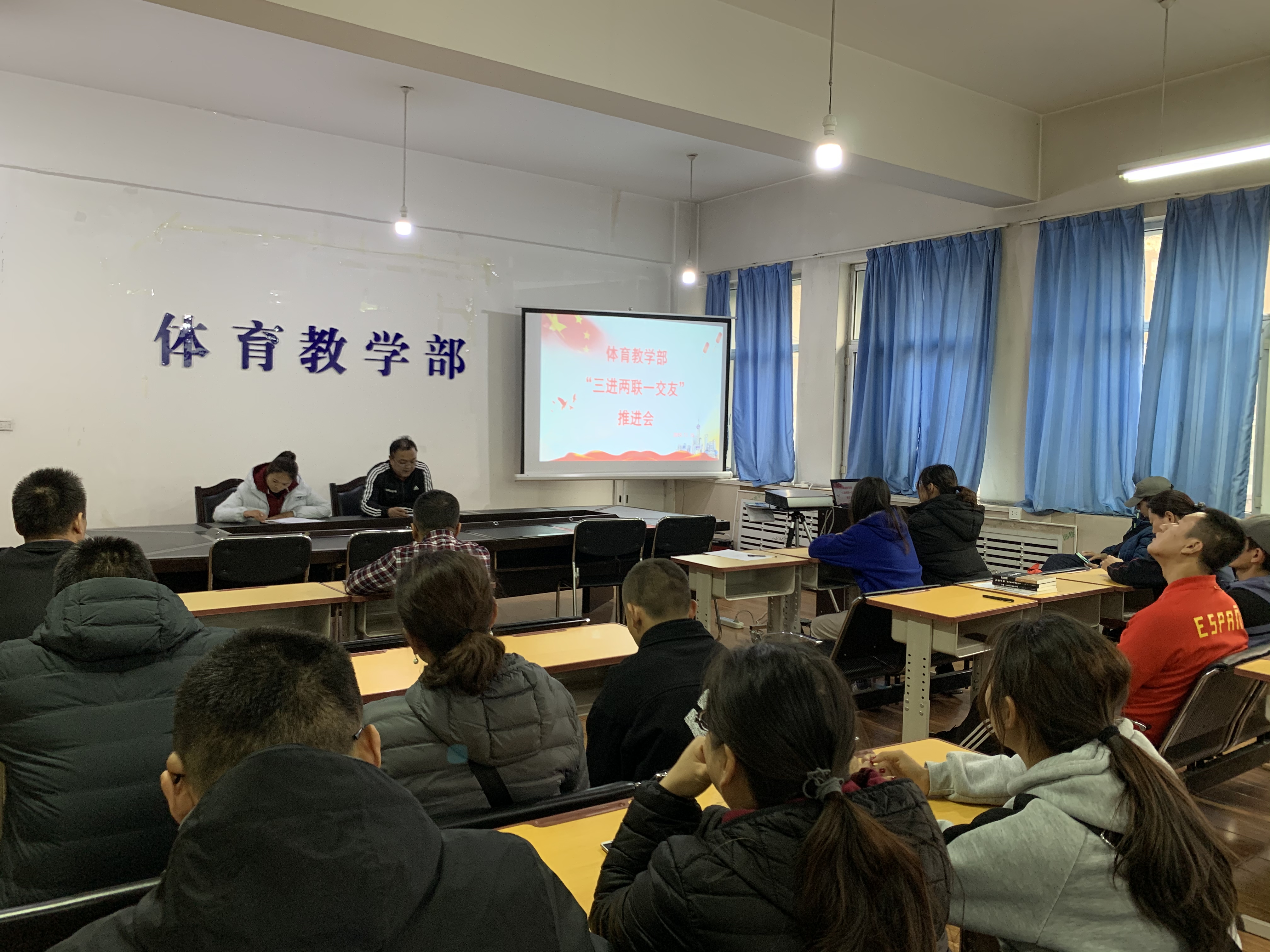2019年11月15日,在体育部党总支副书记、主任亚力昆的支持下,我部召开了“三进两联一交友”活动推进会,在会前本单位师生“四个全覆盖”落实情况进行核查,本单位教师联系的学生均为校运动队的学生,抽选学生进行电话访问,了解其321结对子教师以及活动开展情况,核查师生双向知情情况,领导班子向大家汇报本年三进两联一交友开展情况。