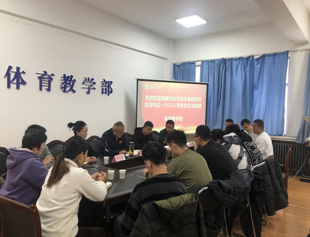 星空彩票体彩版体育教学部主任亚力昆·赛依都、副主任刘恒、教学办、党政办、竞赛中心、体测中心负责人,新疆科技学院体育教研部书记徐龙、主任马英和部门负责人参加座谈会。