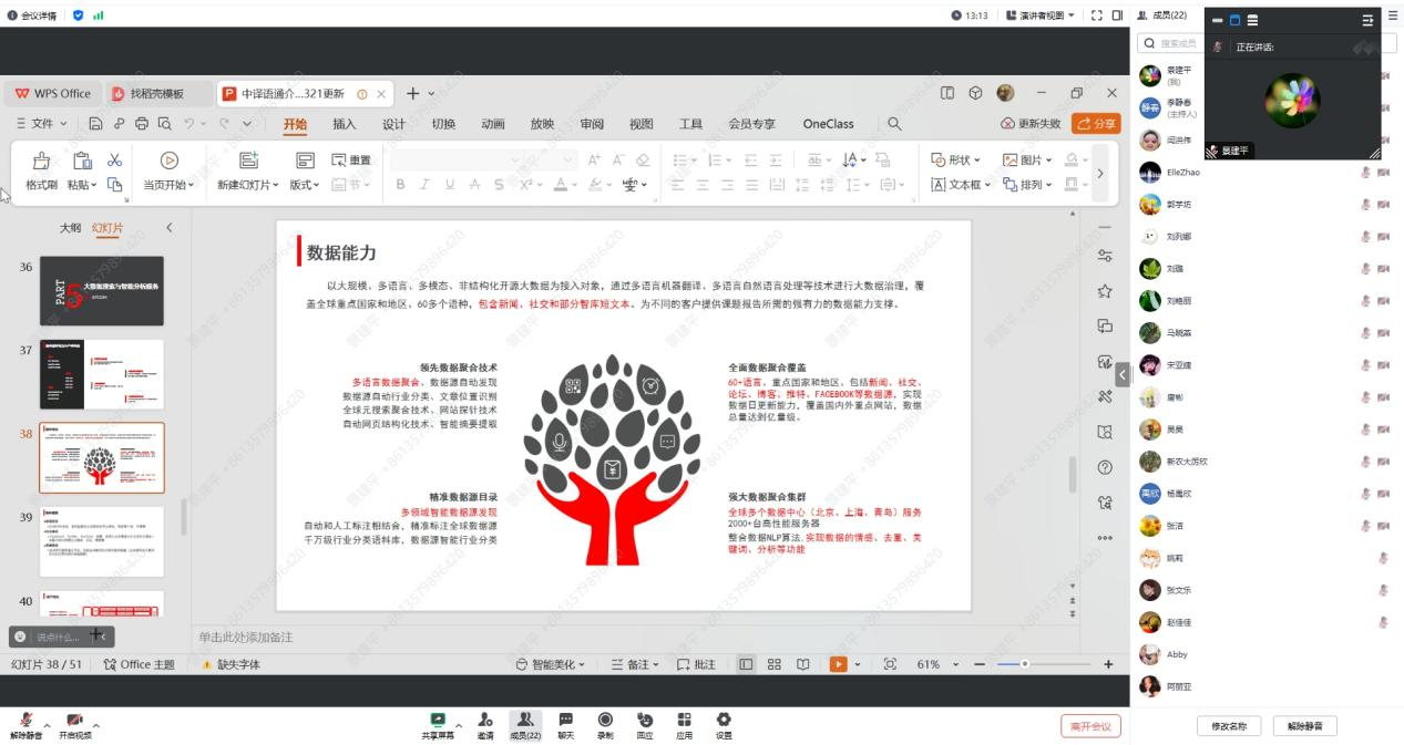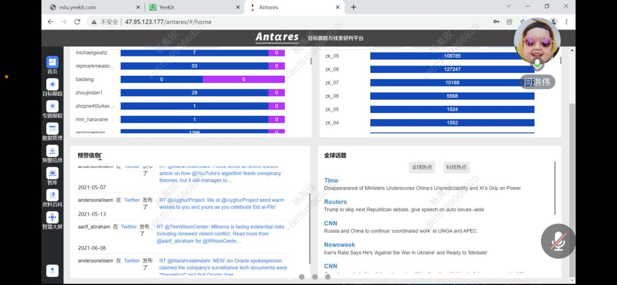 “跨语言大数据分析服务平台”集数据搜索、采集与分析为一体,能够实现对境外主流新闻、社交、智库等海量数据范围内的目标动态跟踪与分析。中译语通MSG事业群项目经理闫洪伟首先为参会教师演示了该平台各模块及其功能,随后分享了四川大学、北京语言大学等高校运用数字化平台开展科研和调研的案例。