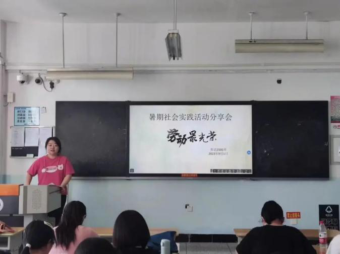 英语2101班高悦同学在暑期社会实践分享会上分享了自己的感受:我在乌苏市文景路社区经历了两周的小区整体巡查社会实践,感慨颇多,我们见到了社会的真实一面,实战生活中每一天遇到的情况还在我脑海里回旋,它给我们带来了意想不到的效果,社会实践活动给生活在都市象牙塔中的大学生们提供了广泛接触社会、了解社会的机会。