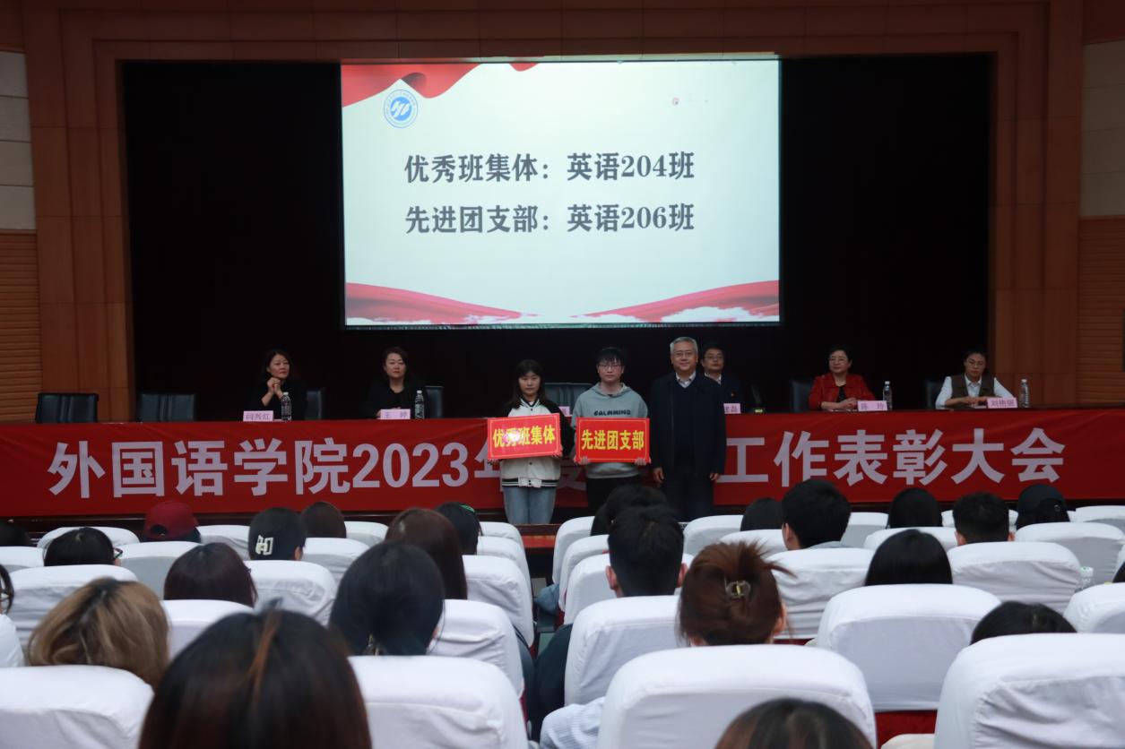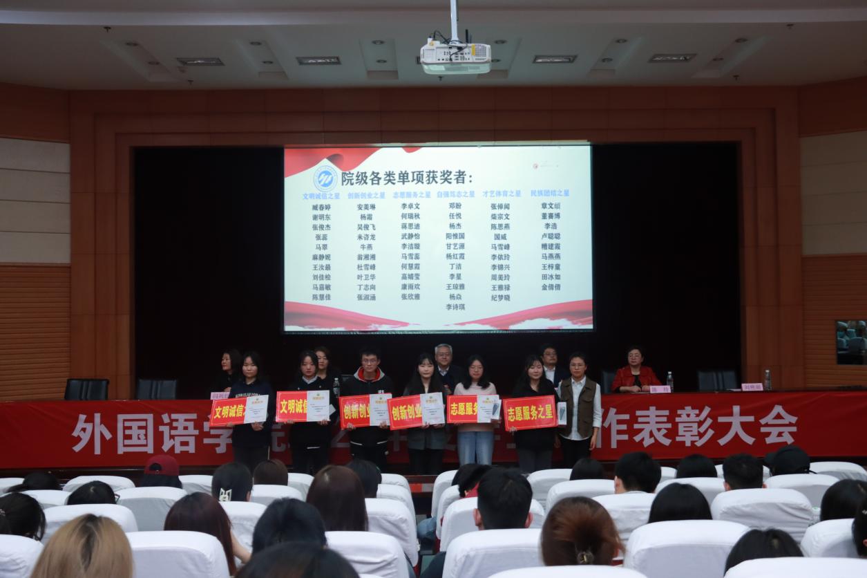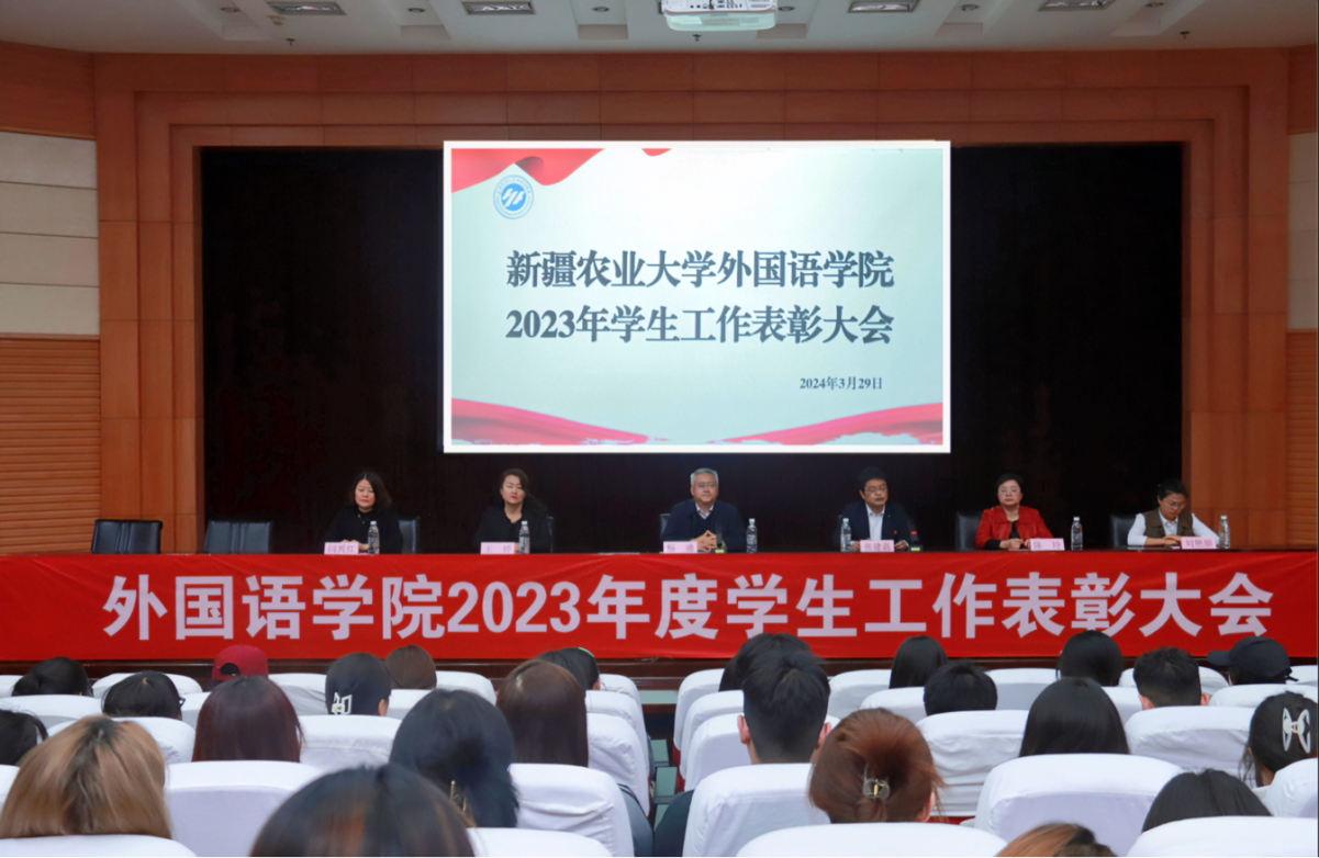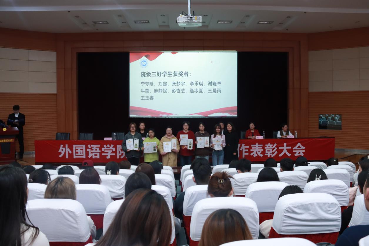 为激励先进,树立典型,激发同学们的学习内驱力,2024年3月29日20:00,外国语学院在学术报告厅举行2023年度学生工作表彰大会。外国语学院党委书记畅通老师,党委副书记、院长张建磊老师,副院长王婷老师,研究生英语系主任陈玲老师,纪委委员闫兴红老师,大学英语系主任刘艳丽老师,“三进两联一交友”教师代表以及全体学生出席本次大会。大会在庄严的国歌声中拉开帷幕,气氛热烈而庄重。