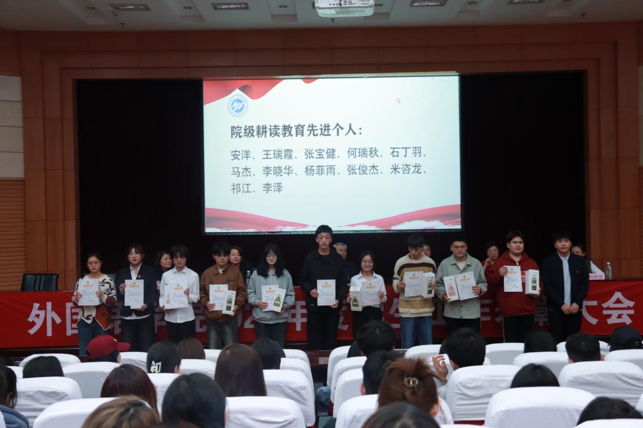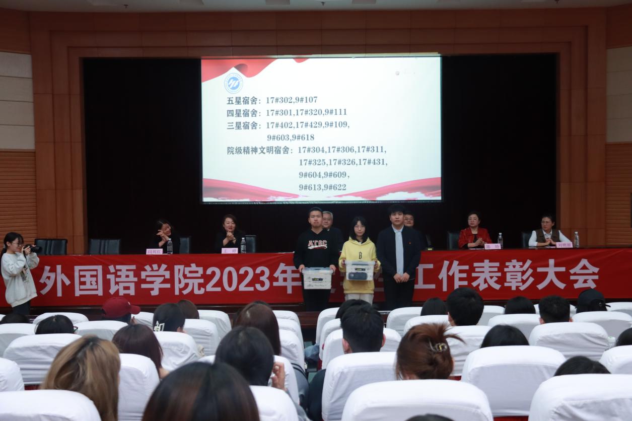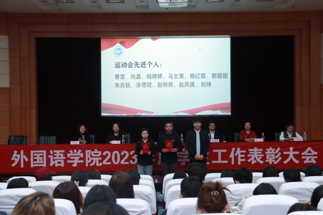 为激励先进,树立典型,激发同学们的学习内驱力,2024年3月29日20:00,外国语学院在学术报告厅举行2023年度学生工作表彰大会。外国语学院党委书记畅通老师,党委副书记、院长张建磊老师,副院长王婷老师,研究生英语系主任陈玲老师,纪委委员闫兴红老师,大学英语系主任刘艳丽老师,“三进两联一交友”教师代表以及全体学生出席本次大会。大会在庄严的国歌声中拉开帷幕,气氛热烈而庄重。