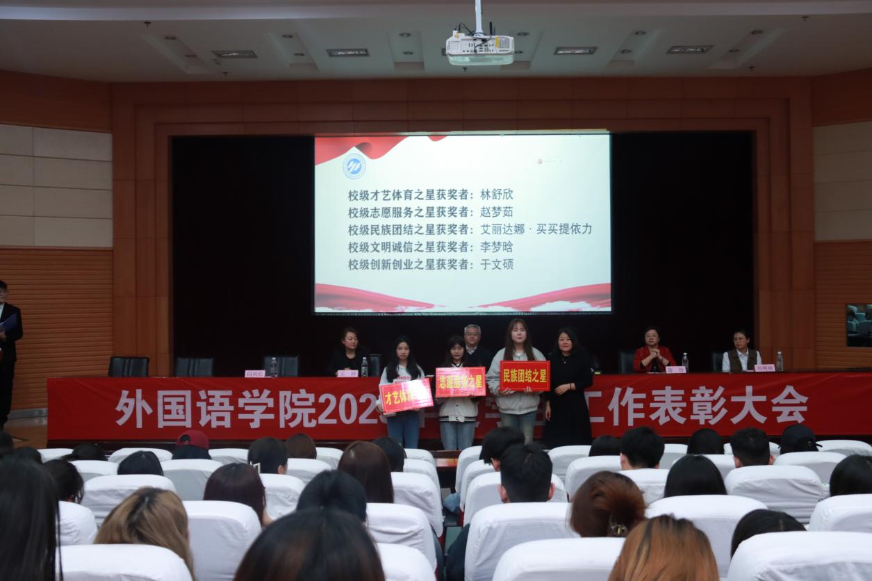 大学英语系主任刘艳丽老师为院级“文明诚信之星”、“创新创业之星”、“志愿服务之星”、“自强笃志之星”、“才艺体育之星”、“民族团结之星””颁奖