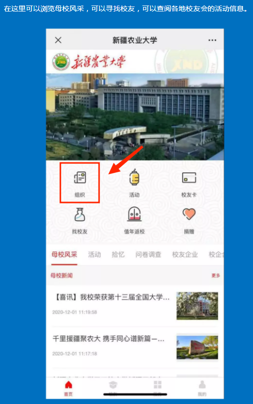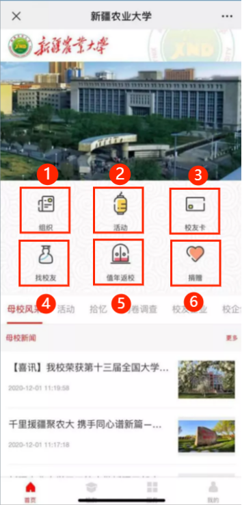 (1)组织:包含48个星空彩票体彩版二级校友分会平台,其中院系校友分会平台23个,疆内地州校友平台8个,疆外省市校友平台14个,海外校友平台3个。可根据自身需要,选择加入相关二级校友分会,参与二级分会组织的相关活动,积极展开联络,增加互动。