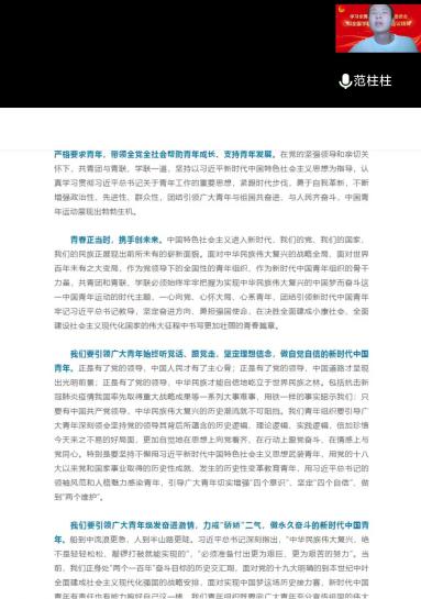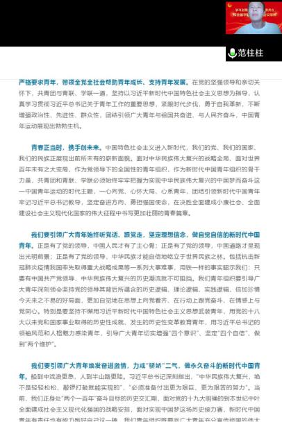 季夏时节,逢迎青春盛会;风华气象,高奏时代凯歌!今年是夺取全面建成小康社会伟大胜利、取得抗击新冠肺炎疫情重大战略成果的不平凡的一年,也是开启第二个百年奋斗目标新征程的继往开来的一年,大会的召开具有重大而深远的意义。我们青年学生要按照党指引的方向,在坚定理想信念中武装头脑,在发奋成长成才中全面发展,在勇于开拓创新中建功立业,在锤炼高尚品德中知行合一,切实提高政治站位,接好历史的接力棒,不负伟大时代的使命和重托。