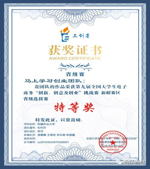 第九届全国大学生电子商务“创新、创意及创业”挑战赛新疆赛区特等奖;