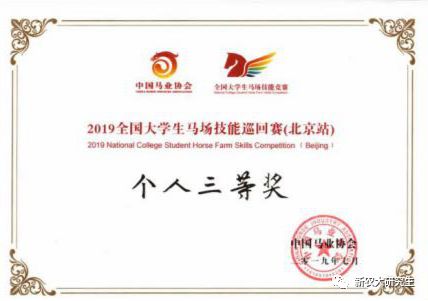 2019年:荣获全国大学生马场技能大赛团体第一名 、个人第三名 、最佳方案奖。