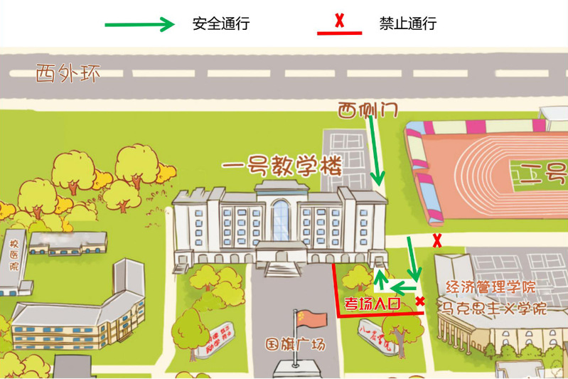 4.本校应届考生在每场考试结束后,从一号教学楼正门离开考场时严禁翻越警戒线离开校园。